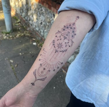 C’est ainsi qu’est née ma proposition de tatouages énergétiques : des créations symboliques, empreintes de douceur, en lien avec la guérison de l’âme. Inspirés par le sacré et l’intime, ils sont conçus comme des ancrages personnels et uniques.. Ici, l’art se mêle à l’âme, sans jamais l’imposer, dans une démarche sincère, respectueuse et profondément humaine.